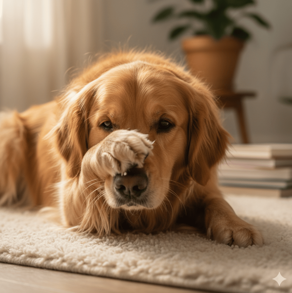 The action starts with the face. Your dog, perhaps while lying down, uses one or both paws to vigorously rub their eyes, muzzle, or cheeks. What motivates this dramatic gesture?